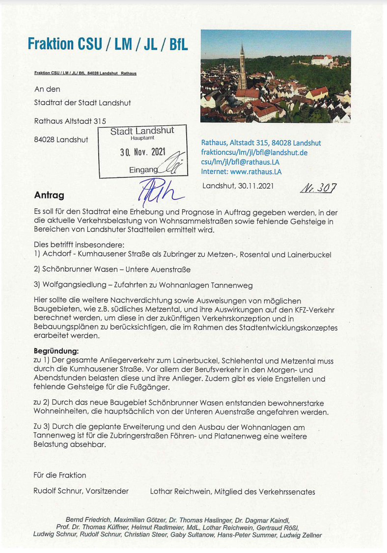 Es soll für den Stadtrat eine Erhebung und Prognose in Auftrag gegeben werden, in der die aktuelle Verkehrsbelastung von Wohnsammelstraßen sowie fehlende Gehsteige in Bereichen von Landshuter Stadtteilen ermittelt wird.